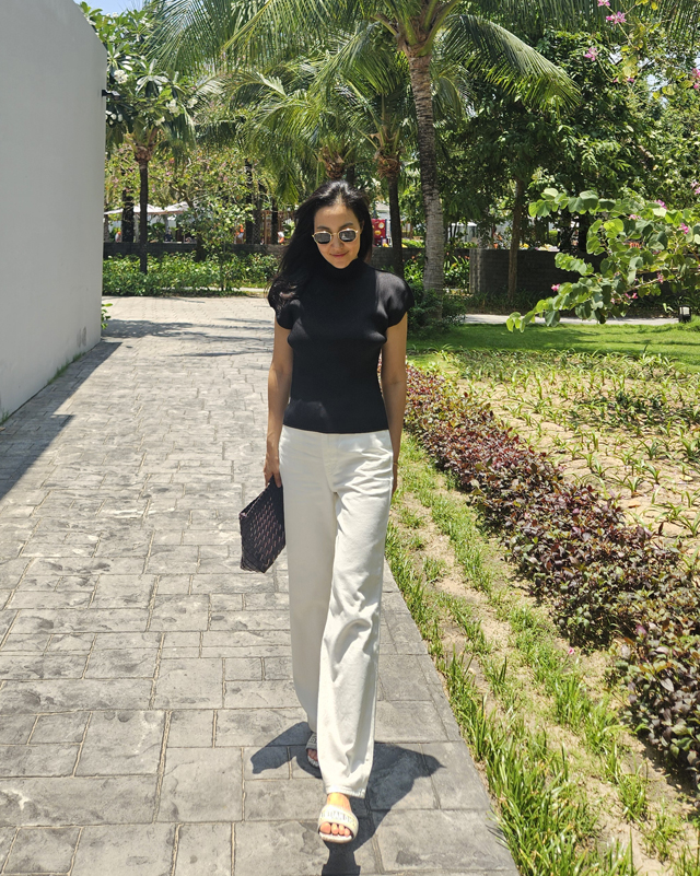 살짝 올라온 반폴라 넥라인과 여성스러운